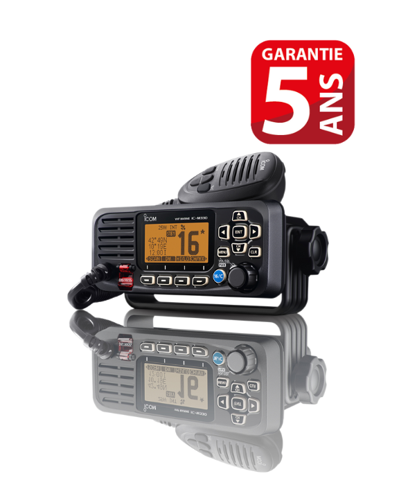VHF Marine fixe 156-163MHz 25W, avec ASN Classe D, étanchéité IPX7, récepteur GPS/GLONASS intégré, 70dB, fonction « AquaQuake » (éjection de l’eau), noire. Livrée avec antenne GPS externe pour récepteur GNSS