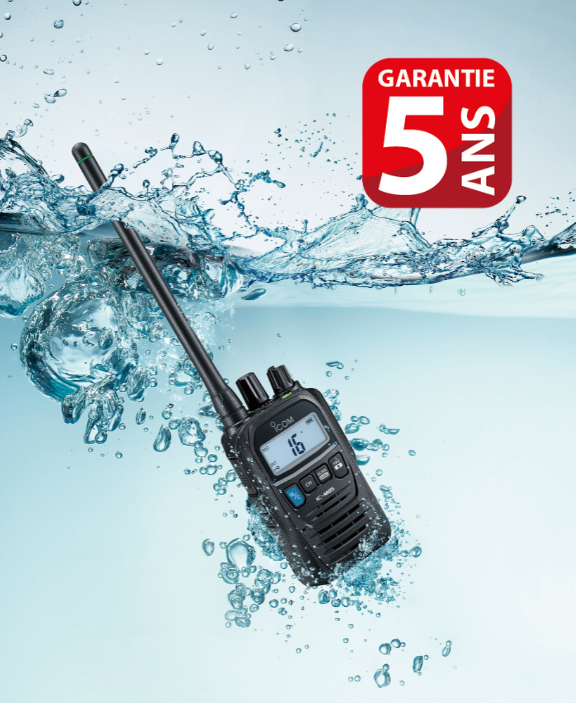 Portatif marine VHF 156-163.425 MHz, 6W, 97 canaux avec écran LCD et clavier, étanchéité IPX8 (immersion 30mn à 1m50 de profondeur), robustesse MIL-STD810G, puissance audio 700mW. Livré avec batterie, chargeur, antenne et